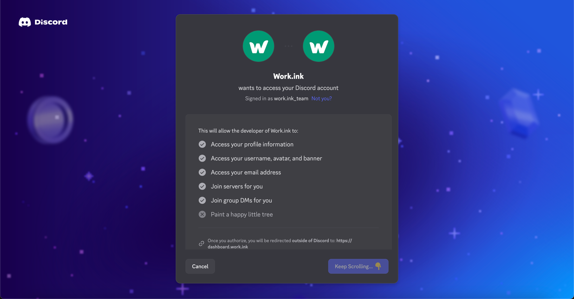 identity: Your Discord User ID, avatar, banner and username. Used to identify your Discord account.email: The Email your Discord account has been registered with. Used in parity withidentity.guilds.join: Join Guilds/Servers with your account. This is used to be able to reach out to you in case of problems by joining your account on the Work.ink Discord guild.gdm.join: Join Group DMs with your account. This is also used to be able to reach out to you in case of problems by putting you in a Group chat with your account manager.