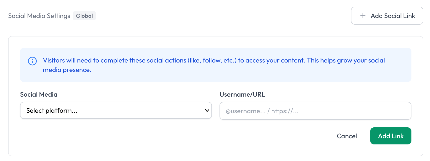 Here you can select a Platform and enter your username in the format shown. For example, if you want to add you TikTok-Account, you need to enter your username.