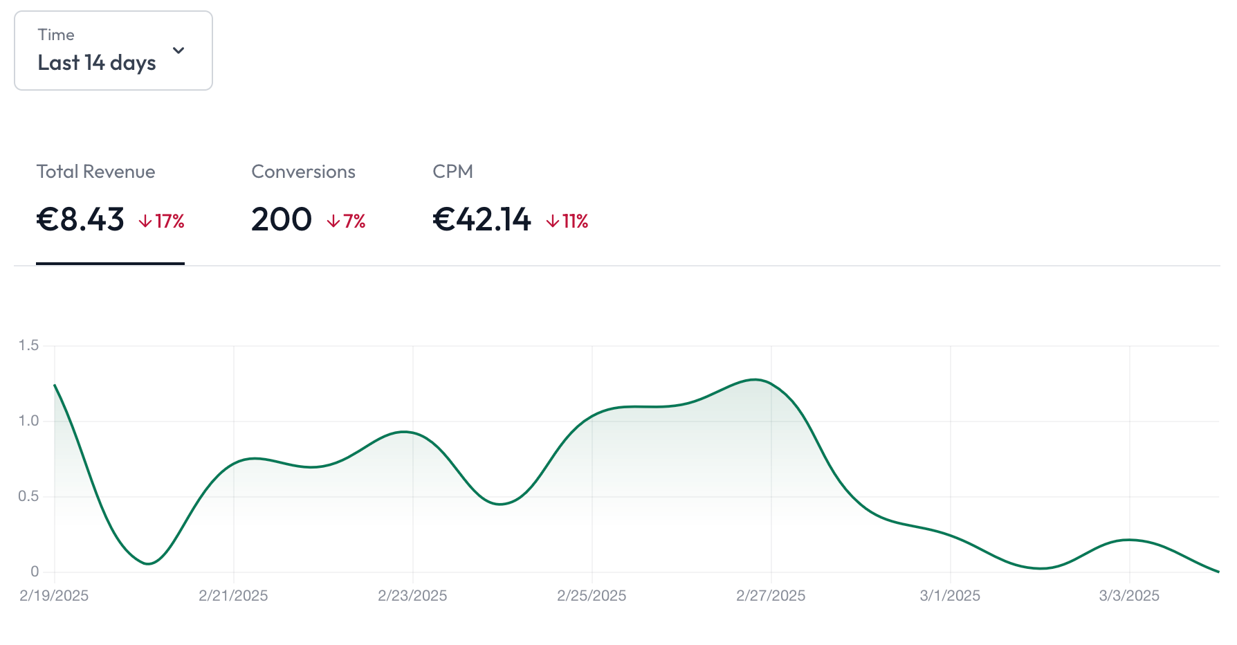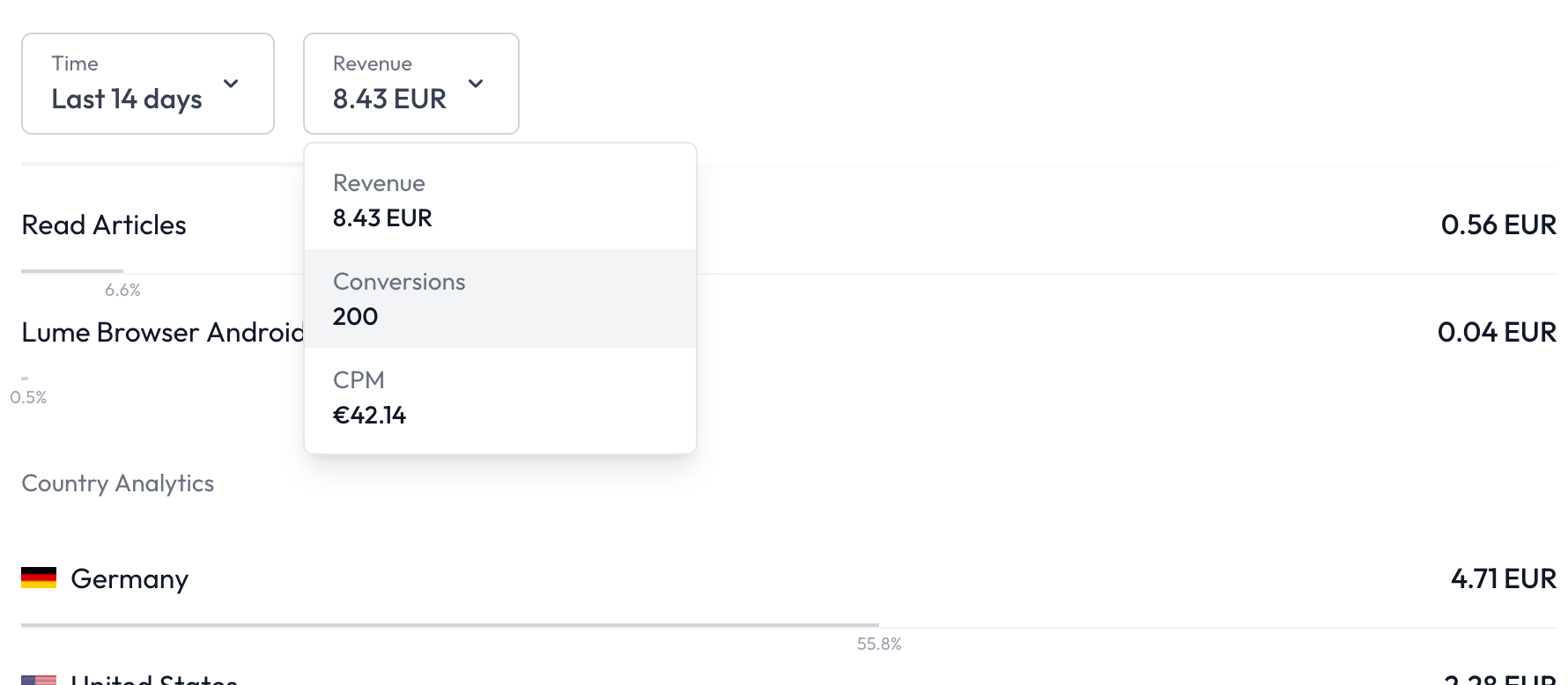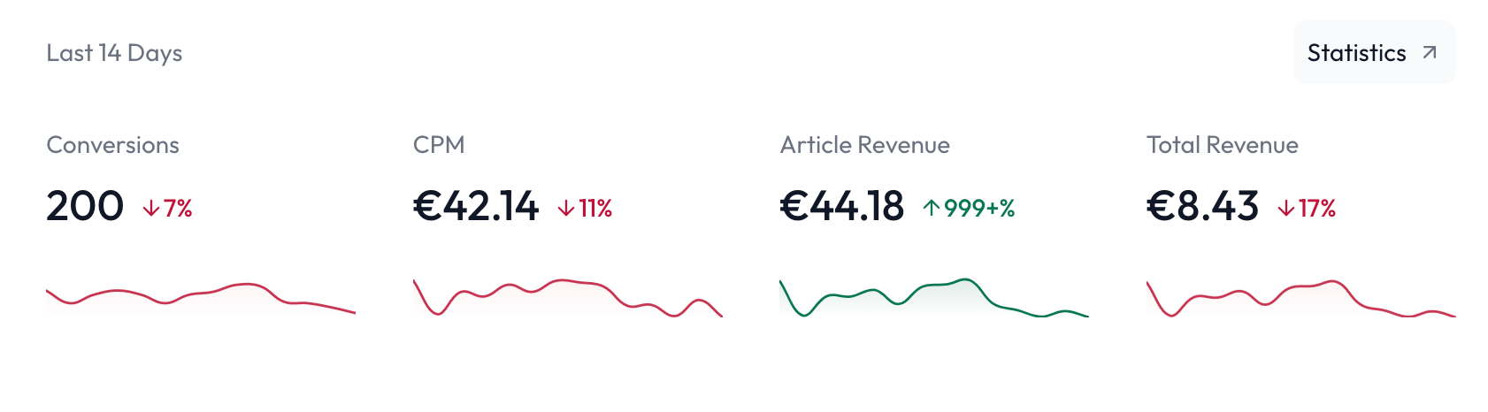 These provide you with the most relevant statistics of the last 14 days. As you can see, you can see you conversion count, your CPM, your revenue generated by the Articles monetization and your total revenue - all complete with a change percentage.