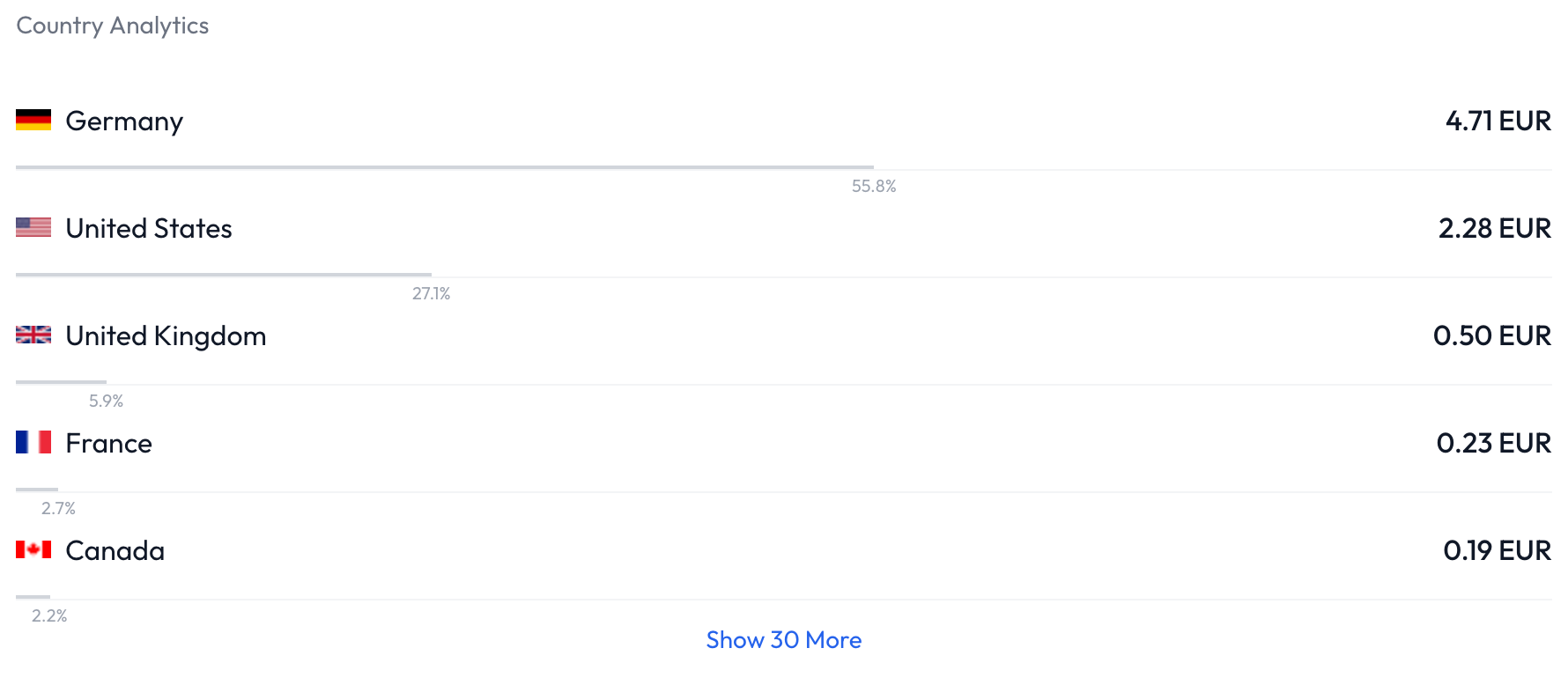 When scrolling down, you likely notice that a drop-down menu appears. Here you can select which metric you want to sort by. You can e.g. select "Conversions" to see how many conversions per country or monetization you have, instead of how much revenue: